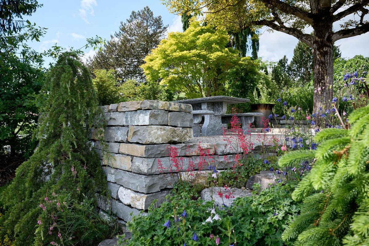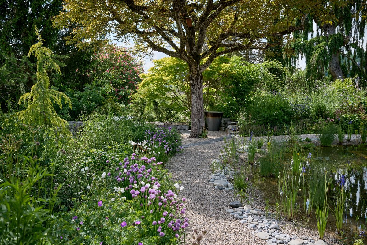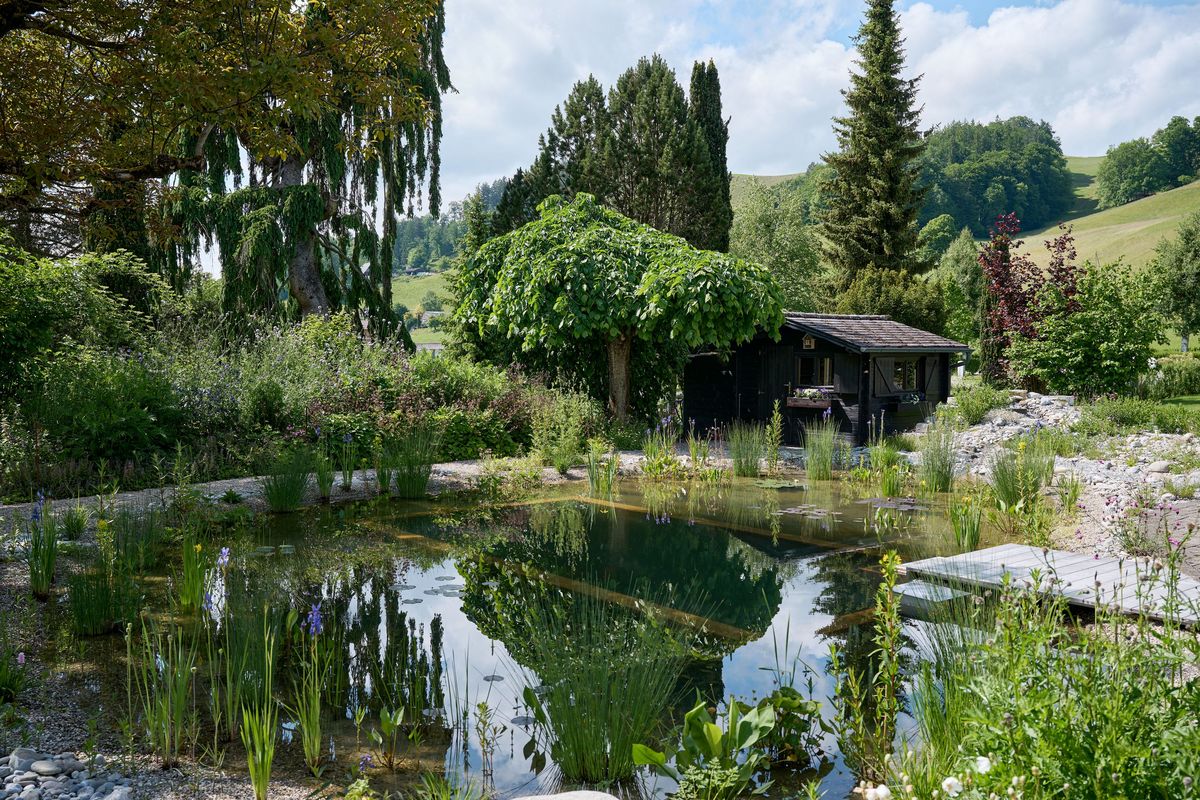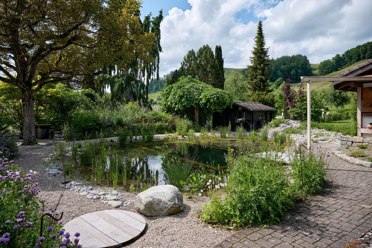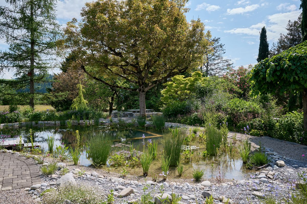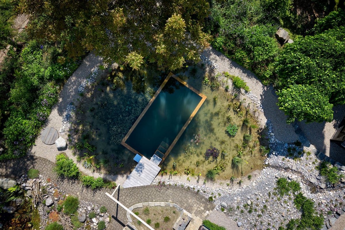 Aus einer öden Rasenfläche wurde eine idyllische Badelandschaft gestaltet. Der biologische Schwimmteich wird mit unterschiedlichen Pflanzflächen umschlossen und gibt dem Garten einen Raum. Das Wasser im Bachlauf plätschert gekonnt in den Teich und bietet vielen Insekten und Vögeln eine natürliche Wasserstelle.